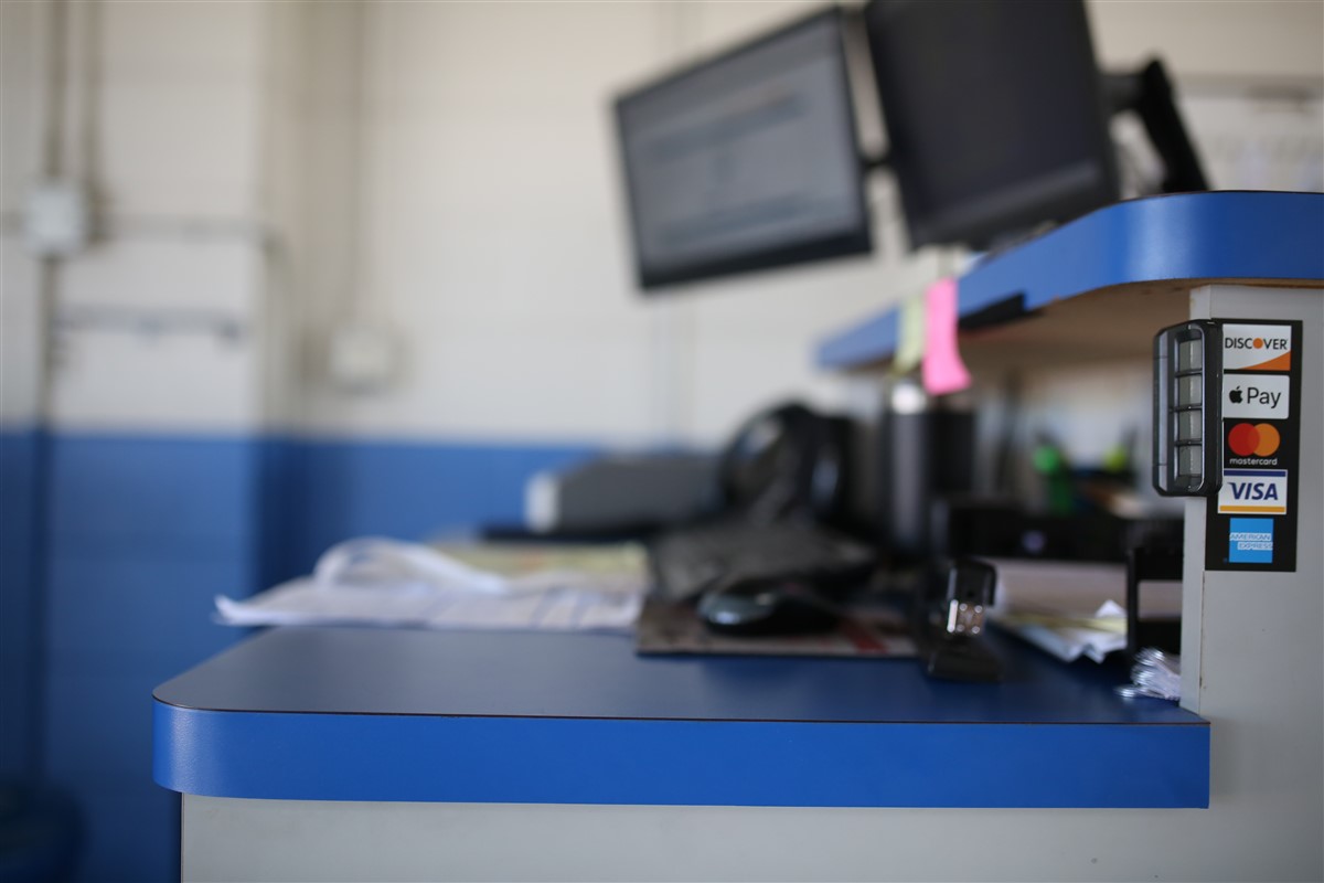 Following along with Honda’s guidelines, we implemented the Honda colors – blue Pionite laminate countertops and @wilsonart dove gray laminate cabinets. In each station we built a cabinet with a lock and key for each employee’s personal belongings, a section of open cubbies for brochures & businesses cards, a monitor tower cabinet, and a recessed area for pens, calculators, staplers, etc. Two of them had printer stations that we built into the lower portion of the workstations. Of course, this came with many different power cables and cords, so we installed grommets in the countertops so everything could be hooked up and ready to go.